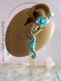 This lovely seahorse is hand painted and sealed by me. The seahorse and the flower is teal in color so it matches the overall feeling. This ear cuff is decorated with flower, swarovski crystals and pearls, coral, metal beads and 14k gold plated chains. The chains make the ear cuff looks more feminine and elegant.